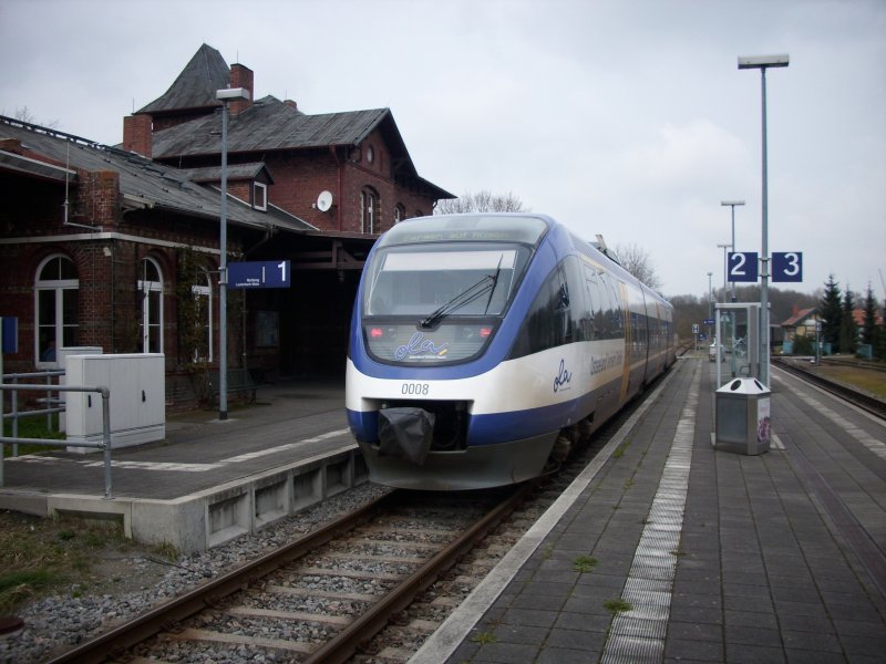 Talent 0008 der OLA am 10.04.2008 auf der Fahrt von Lauterbach Mole nach Bergen/Rügen beim Zwischenhalt in Putbus
