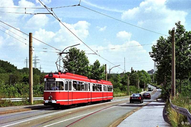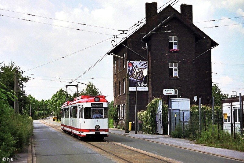 Tw 5 auf dem eingleisigen Abschnitt zwischen Marten und Dorstfeld (29. Juli 1997)