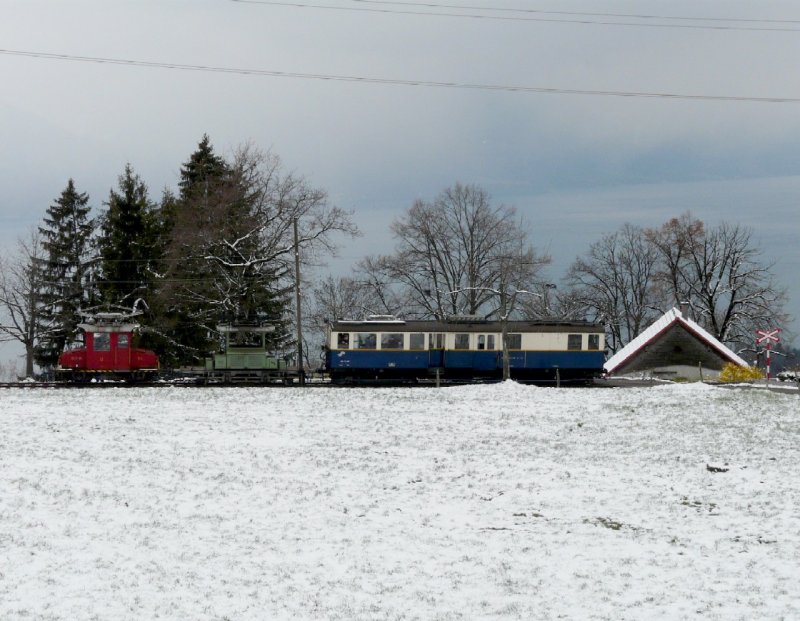 BC - Zu Besuch bei der BC der MOB Triebwagen De 4/4 28 mit zwei Fahrzeuhen Xe 2/2 926 + tpf Te 2/2 12 im Schlepp unterwegs nach Blonay am 24.03.2008