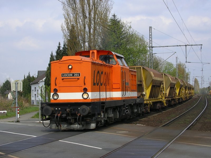 Die LOCON 201 (DR 100) mit Wagen von Spitzke Logistik auf dem Weg um Gleisschotter zu fassen.(18.04.2008)