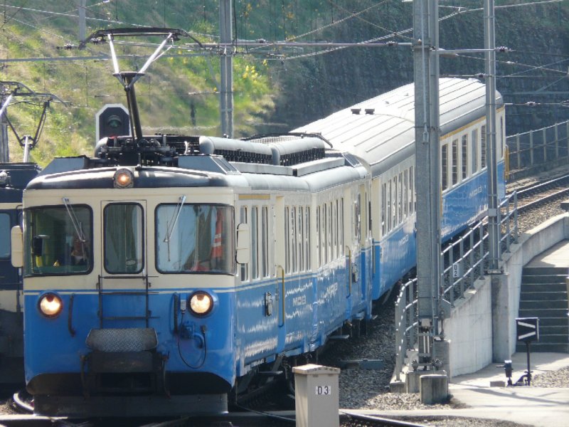 MOB - Regionalzug mit Triebwagen ABDe 8/8 4001 und 3 Personenwagen BD + AB + B im Bahnhof von Montreux am 05.04.2008
