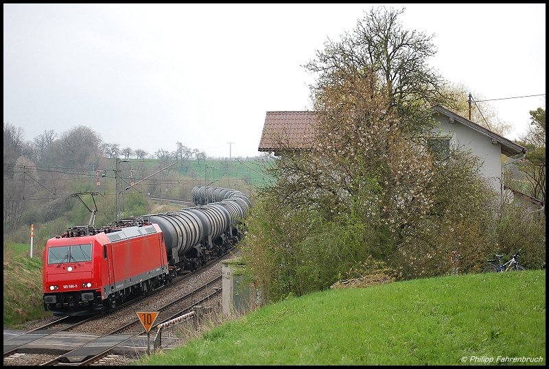 185 586 der HGK wurde am 22.04.08 mit einer Kesselzug-Sonderleistung am Km 77,6 der Remsbahn (KBS 786) in Höhe Aalen-Oberalfingen bildlich festgehalten.