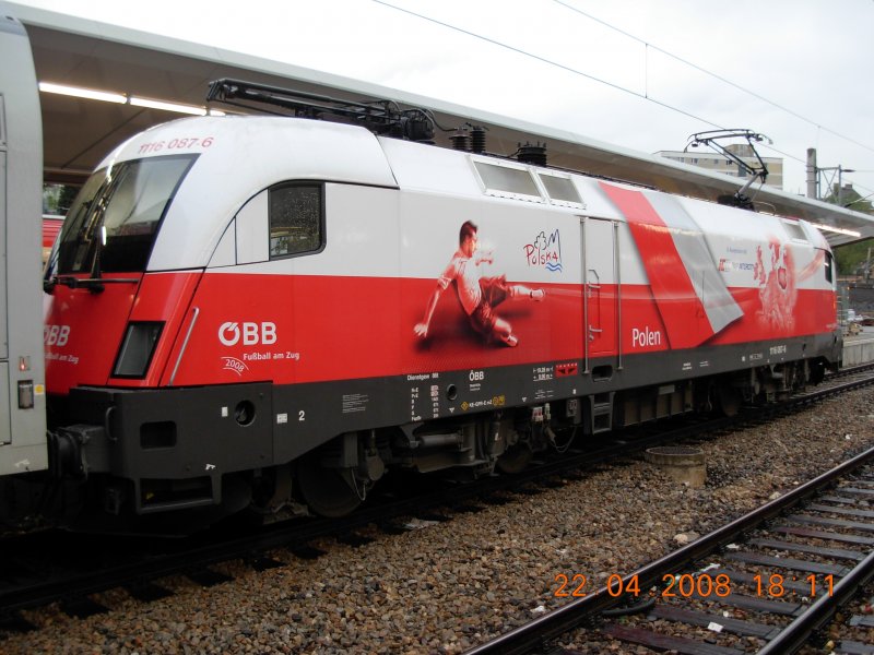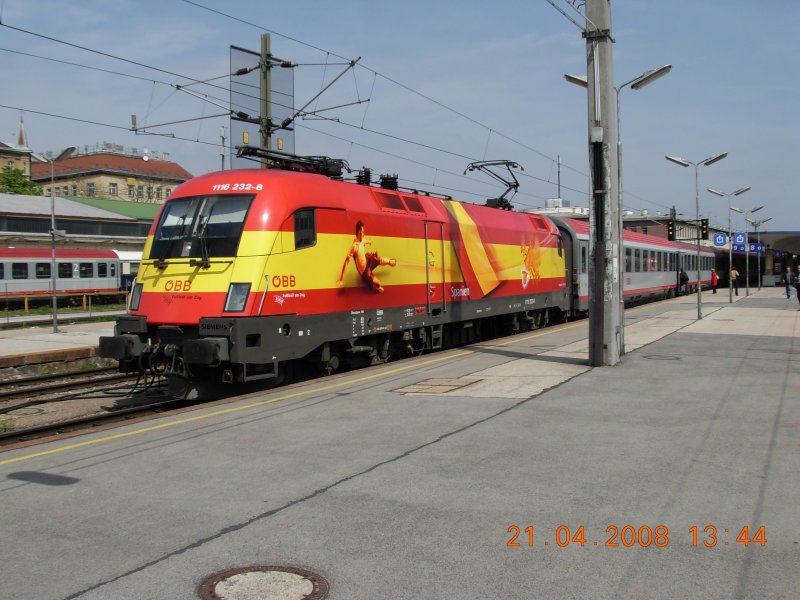 Die Spanien-Lok 1116 232-8 vor dem OEC 566 "Stadt Innsbruck" bei idealen Lichtverhältnissen auf dem Wiener Westbahnhof kurz vor der Abfahrt nach Bregenz. Foto vom 21.4.2008.
