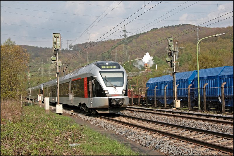 ABELLIO FLIRT Doppel als RE 16 alias ABR 99616/99646 von Essen Hbf. nach Iserlohn,der zweite Teil in Lethmate nach Siegen ,wird im Bochumer Hbf. wegen Verspätung auf Gleis 6 umgeleitet.(24.04.2008)