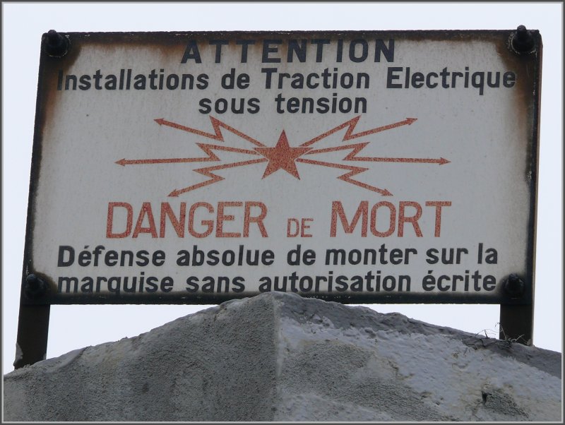 Todesgefahr! Wer auch mal etwas in die Höhe schaut, entdeckt auf den Enden der Bahnsteigdächer in Mulhouse diese Warntafeln. (08.04.2008)
