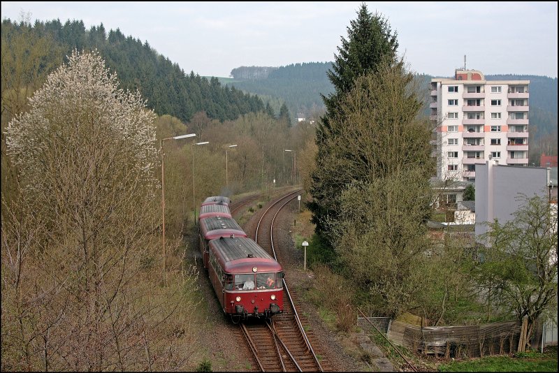 Schneller Standortwechsel: Nach kurzem Aufenthalt in Brügge(Westf), knattert die Schienenbusgarnitur, über die Volmetalstrecke Richtung Hagen. (26.04.2008)