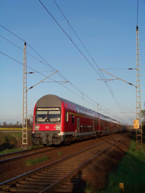 Ein Doppelstockzug unterwegs auf der Rottalbahn am 20.04.2008 mit einem Speisewagen der als Fahrradwagen genutzt wurde. Das ist ganz was besonderes weil auf dieser Strecke normalerweise nur Triebwagen der BR 628 und am Samstag der IC Rottalerland fahren. Der Zug ist zusehen bei Pfarrkirchen Ost.
