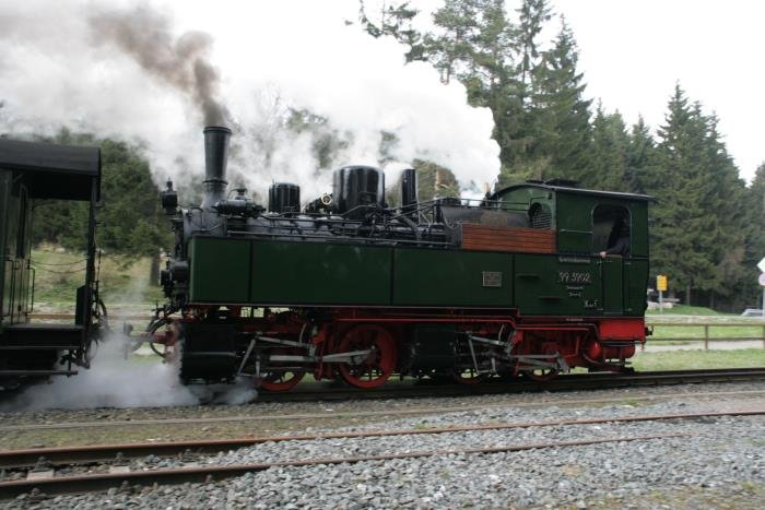 Auf meiner gestrigen Wanderung zu den Zeterklippen hörte ich, dass die 99 5902 mit einem Sonderzug zum Brocken fuhr. Zurück in Drei-Annen-Hohne erkundigte ich mich nach der Rückkehr des Zuges und erfuhr, dass ich nur 20 min. warten musste. Dann sah ich zum ersten mal die 99 5902 in ihrem neuem Gewand; 26.04.2008
