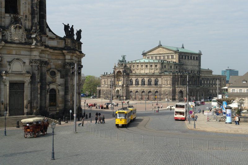 Am 23.04.08 war ich in Dresden unterwegs, um die letzten im Einsatz befindlichen Tatrazüge vom Typ T4D zu fotografieren. Hier sieht man einen Zug der Linie 8 mit 224 259 an der Spitze vor der Semperoper.