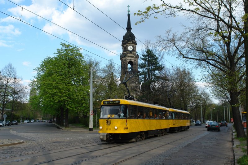 Die Trinitatiskirche im Dresdner Stadtteil Johannstadt bildet einen schönen Hintergrund für den Tatrazug, der Richtung Gorbitz auf der Linie 6 unterwegs ist. (23.04.08)