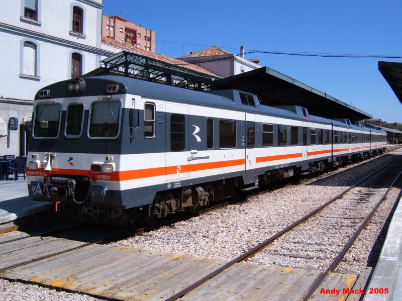 Ein Triebzug BR 592.2 steht an einem kleinen Bahnhof auf der Strecke Cuenca - Valencia im Sommer 2005.