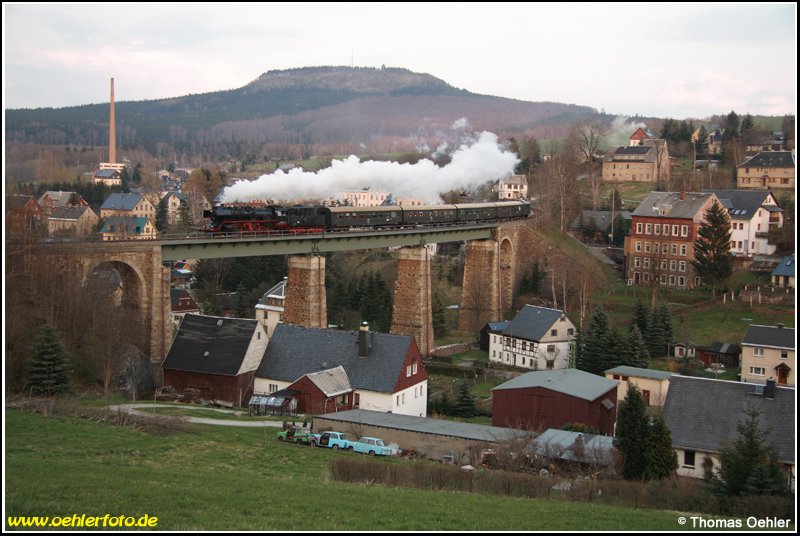 Im letzten Licht der bereits versunkenen Sonne überquert 50 3648 mit dem SEM-Museumszug am Abend des 26.04.08 das Markersbacher Viadukt.