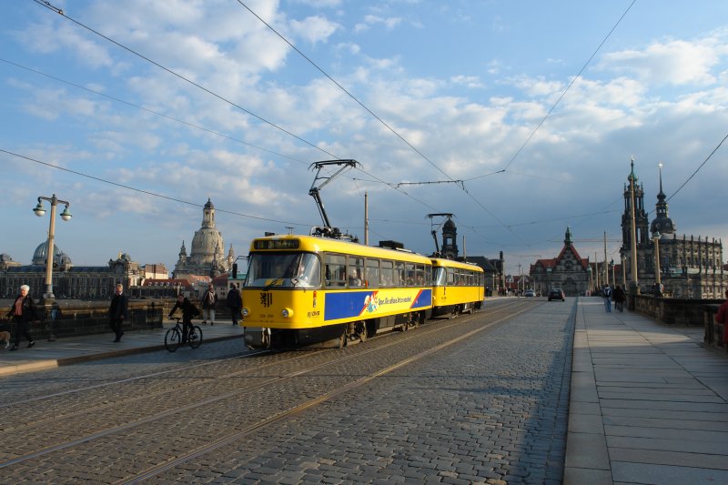 Von der Augustusbrücke aus hat man einen herrlichen Ausblick auf die historische Bauten von Elbflorenz. Der T4D macht vor dieser Kulisse einen meiner Meinung nach sehr guten Eindruck. Er ist als Linie 8 Richtung Hellerau unterwegs. (23.04.08)