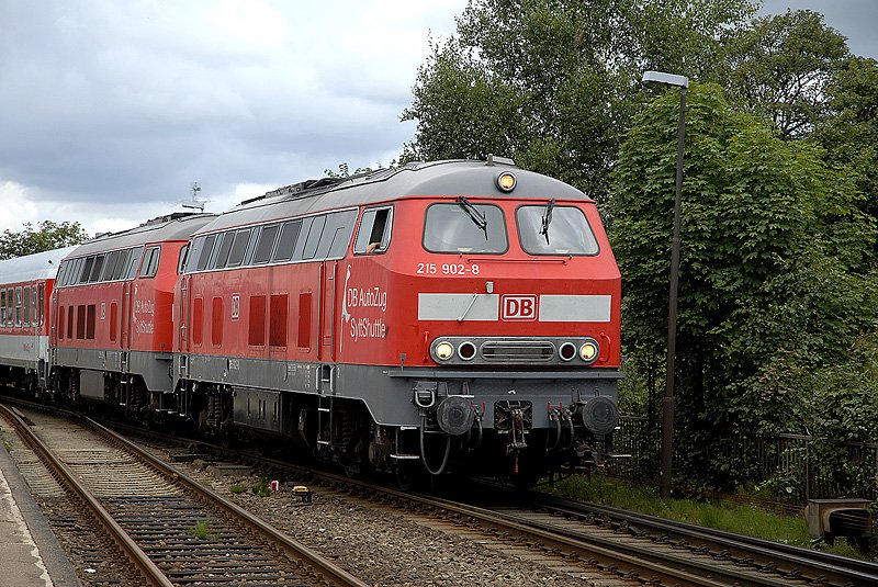 215 905 + 902 setze sich vor einem Autozug zur Insel Sylt. Niebüll 14.08.2006