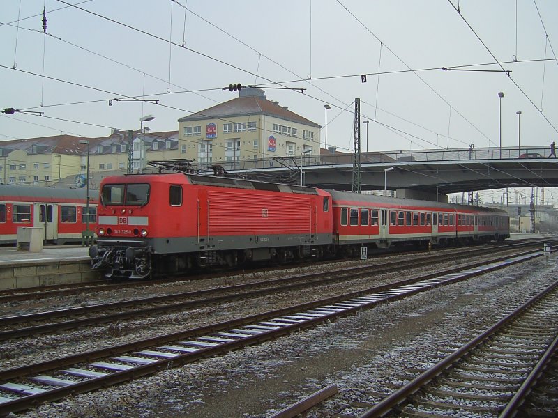 Die 143 325 mit einer RB die aus nur 2 Wagen bestand am 21.12.2007 bei der Einfahrt in Regensburg Hbf.