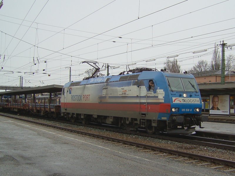 Die 185 518 von TX Logistik am 02.02.2008 mit einem Stahlzug bei der Durchfahrt in Rosenheim.