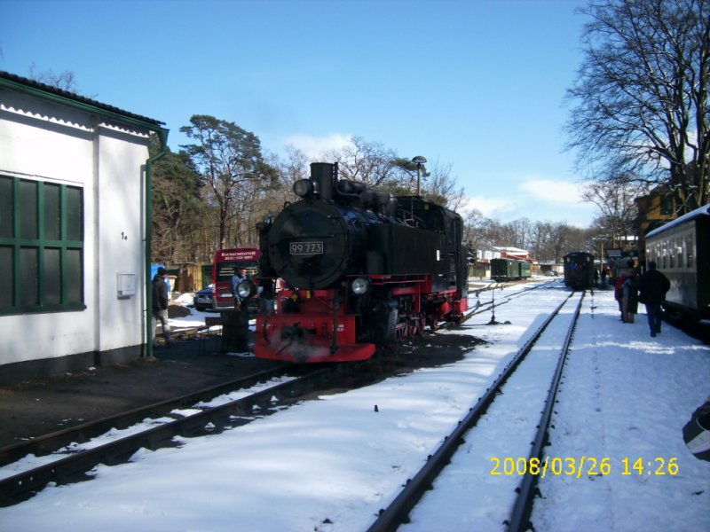 Wintereinbruch in MV und erst recht auf Rügen. Nach der Überführung von 99 787, 4 Reisezugwagen aus Zittau und einem Packwagen aus Jöstadt konnte der Übergangsverkehr zu Ostern aufgenommen werden. Am 26.03.2008 fährt 99 773 mit einen Personenzug nach Binz LB aus dem Bahnhof Göhren (Rüg) aus. Über Ostern teilten sich 99 773 und 99 787 die Zugleistungen und wechselten sich ab. Nach Ostern wsr nur noch 99 773 in Einsatz.
