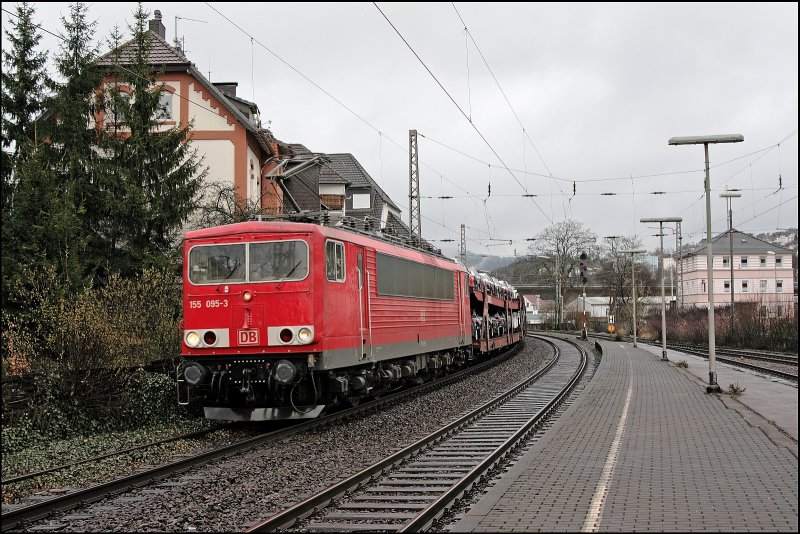 Ihre Käufer warten schon: 155 095 von ähh DBCargoRaiLioNDBLogisticsSchenker durchfährt mit dem CSQ 60062 "AUDI-EXPRESS" den Bahnhof Plettenberg nach Emden VW. Mal gucken wie lange der "DB-Keks" sich auf den Loks halten wird....(05.04.2008)
