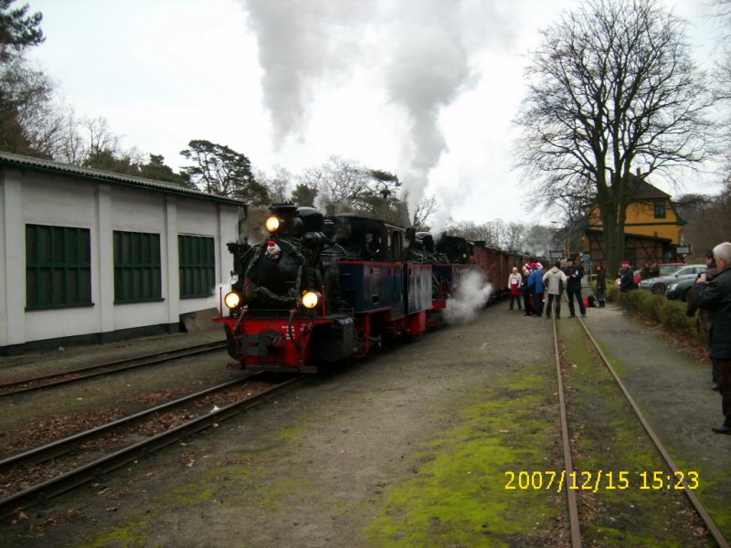Nicki + Frank S und Aquarius C sind gemeinsam im Einsatz. Diesmal bespannen beide den Sonderzug zu Weinachtendes Modellbahnclubs Sassnitz. Für die eine die letzte Fahrt für die andere die erste. Die letzte für Nicki+Frank S. Sie wurde am 16.01.2008 aus Putbus ins DLW Meiningen überführt und soll für einen Einsatz auf der Dampf-Kleinbahn Mühlenstroth auf 600mm umgespurt werden und zugleich eine HU erhalten. Für Aquarius C der erste nach der erfolgten HU in Putbus, die fast 2 Jahre gedauert hat. In Frühjahr 2008 soll Sie noch einen neuen Lack bekommen und erstrahlt hoffentlich bald wieder im alten Glanz.