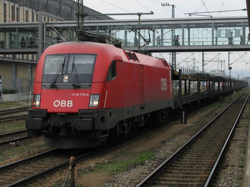 1116 005 ist am 05.04.08 mit einem Güterzug nach Passau unterwegs. Aufgenommen bei Würzburg.