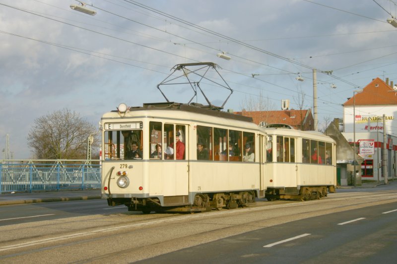 Dortmunder Museumstriebwagen 279 mit Beiwagen im Museumsliniendienst auf der Rheinischen Straße in Dortmund - Dorstfeld am 2.Februar 2008