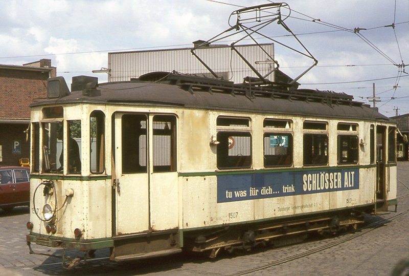 DVG 2x-Tw 1507 -ex 507 - , ehemals Kreis - Ruhrorter - Straßenbahn, im Einsatz als Schlepp - und Rangiertriebwagen beim Depot Grunewald der Duisburger Verkehrsgesellschaft. Juli 1972