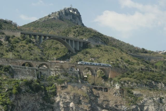 Mein vorerst letztes Bild aus Campanien vermittelt ein Hauch von abenteuerlicher Modellbahngestaltung. Ein Minuetto im Brückenwirrwarr von Viadukten der Autostrada 3, der alten Bahntrasse von Salerno nach Napoli und der Superstrade 18. Salerno, 31.03.2008