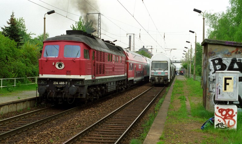 Im Fahrplanjahr 1998/99 gab es ein 234 bespanntes Zugpaar auf der Relation Dresden-Pirna. Am 28. April 1999 verlaesst 234468 Dresden Dobritz in Richtung Dresden Hbf.