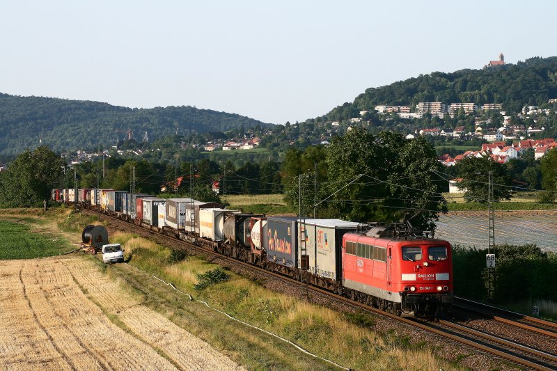 Kurz vor 20 Uhr bespannt 151 041 am 25. Juli 2008 einen Container/KV - Zug und konnte bei Großsachsen-Heddesheim an der Bergstraße im letzten Licht bildlich festgehalten werden.