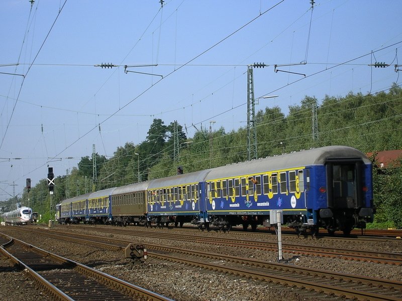 6 Partywagen zieht die Re4/4I 1008 zum Eurostrand Mosel,hier in Bochum Ehrenfeld Begegnung mit ICE 3,ICE 614 aus München nach Dortmund Hbf.(15.08.2008)