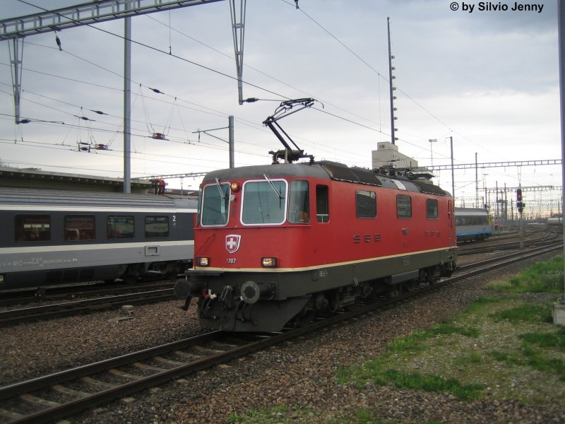 Noch ohne Klimaanlage fährt die Re 4/4'' 11207 am 1.8.08 ans Perron des HB Zürich um den IR 781 nach Chur zu bespannen.
