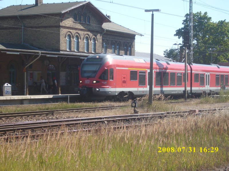 Bei der Aufnahme stande ich nicht im Gleis (!).Flirt 427 004 bei der Ausfahrt am 02.08.2008 aus dem Bahnhof Bergen/Rügen.