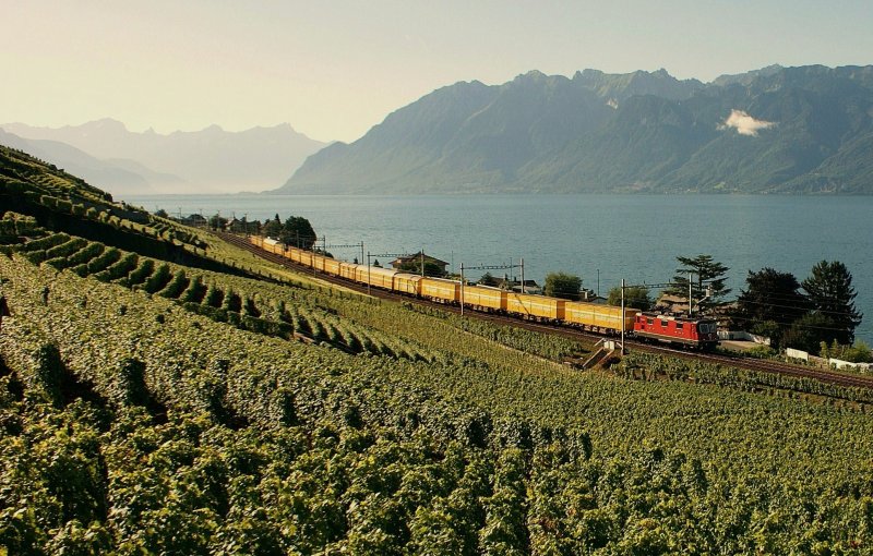 Im Morgen-(Gegenlicht): Gelber Postzug in den grünen Weinbergen des Lavaux bei Cully am 13. August 2008.