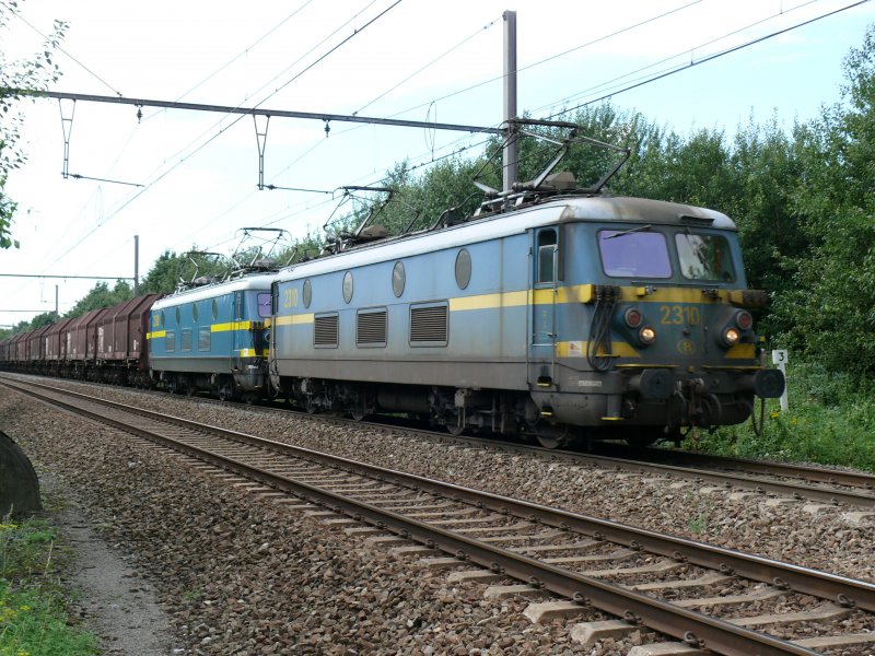 2310 und 2380 ziehen einen schweren Güterzug von Visé kommend in Richtung Montzen (Linie 24). Aufgenommen am 11/08/2008 bei Warsage.