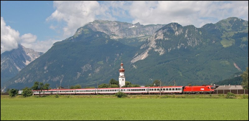Eine 1116er bringt den OEC 189 "Val Gardena/Grödnertal" durch das schöne Inntal nach München. (05.07.2008)