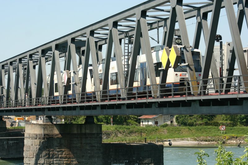 OSB VT 512 "Oppenau" und VT 513 "Stadt Achern" auf der Eisenbahnbrücke zwischen Kehl und Starssbourg am 12.5.2008.