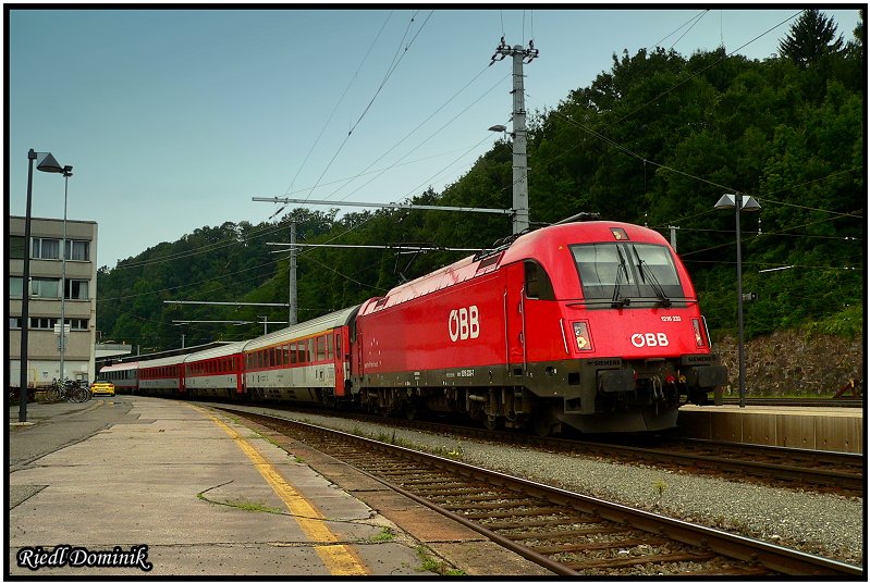1216 233 mit dem wie so oft verspäteten EC 101 im Bahnhof Leoben. 02.08.2008