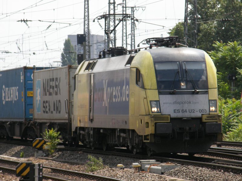Dispolok ES 64 U2-003 "Box-Express" fährt am 16.07.2008 durch den Mannheimer Hbf.