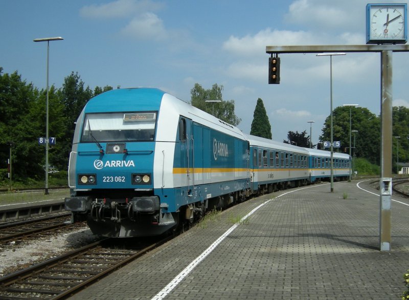 Auch hier setzt die Uhr eine eckigen Bildgestaltungpunkt, Grund zum Einbezug der Uhr, war aber eher die harmonisch zum ALEX passende Farbe; 223 062 mit Alx 86208 aus München trifft am 28. Juli 2008 in Lindau ein
