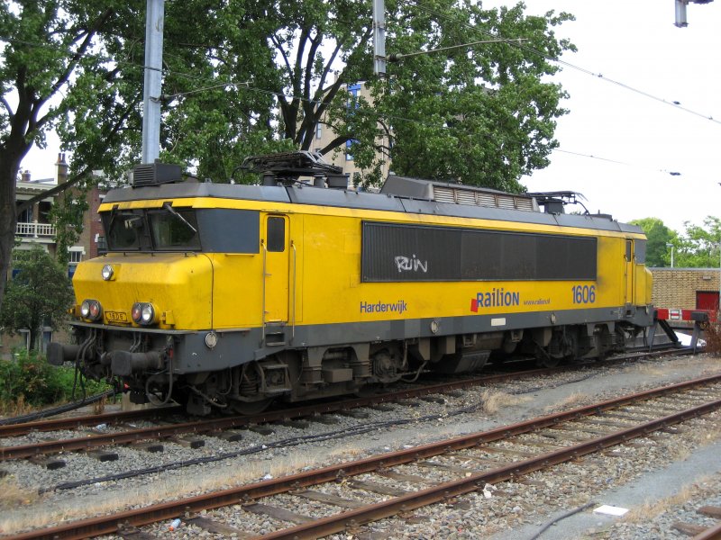 Die formschöne, blutorange 1044 040 rauscht in Wien Simmering an einem neben dem Bahndamm entsorgten Fernsehapparat vorbei ...