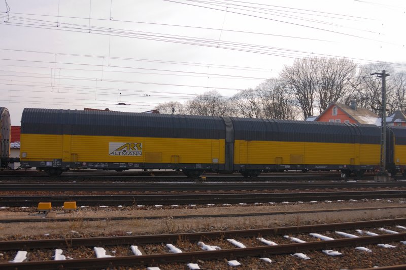 Auf die Wünsche der Kunden zugeschnitten: Sogenannte "Hccrrs-Duos" bieten dem Kunden ein Maximum an Flexibilität in Sachen Länge der Ladung. Gleichzeitig bauen sie relativ leicht und schützen das Ladegut gegen Witterungseinflüsse. Sie werden meist wie hier als Ganzzug gefahren. (Treuchtlingen, 28.11.2008).