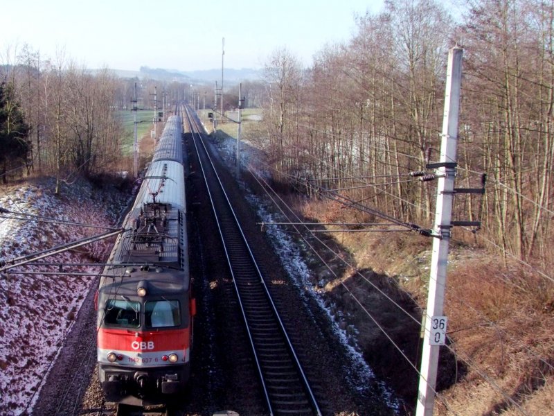 ICE21 rauscht bei Kimpling Richtung Wels, man beachte ggf. auch das "verworfene" Nebengleis; 081229