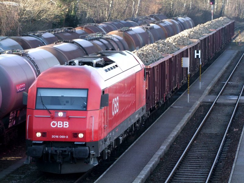 2016 069-3 ist soeben vom Rübenverladeplatz Geinberg mit 9 Ea*s-Wagen am Bhf. Ried eingetroffen; 081229