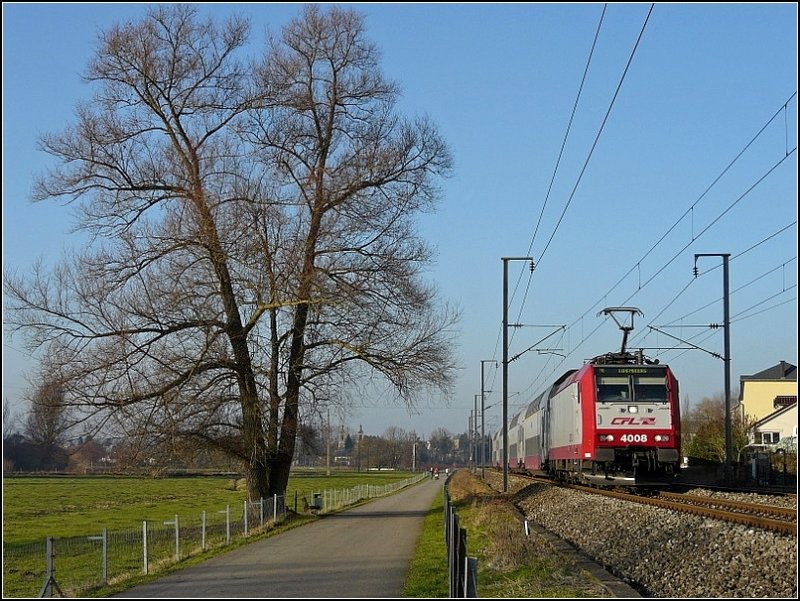 Der Wanderweg zwischen Lintgen und Mersch bietet bei herrlichem Winterwetter neue Perspektiven, die E-Lok 4008 in Richtung Luxemburg zu fotografieren. (Jeanny)