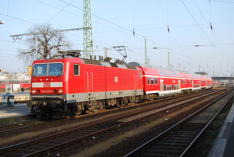 E-Lok der Baureihe 143 (143 935-5) steht mit den Regional-Express nach Leipzig Hbf in Cottbus Hbf.