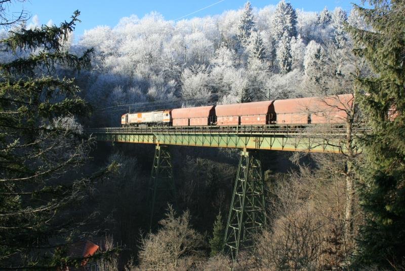 V330.2 zieht einen Kalkschotterzug über das Kreuztalviadukt; 30.12.2008