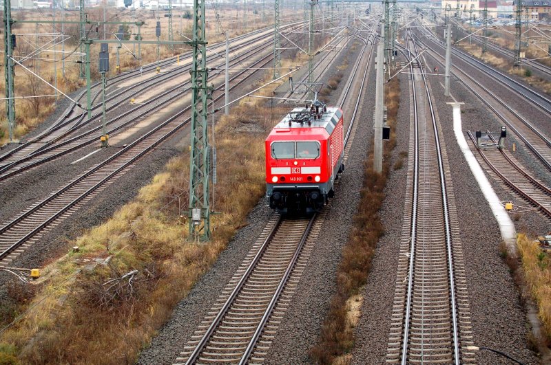 Wahrscheinlich auf Probefahrt: 143 021 vom Bw Frankfurt(M)1 am 04.12.08 in Bitterfeld. Als ich gegen 13 Uhr wieder mit dem Auto unterwwegs war, habe ich sie wieder Richtung Dessau fahren sehen.