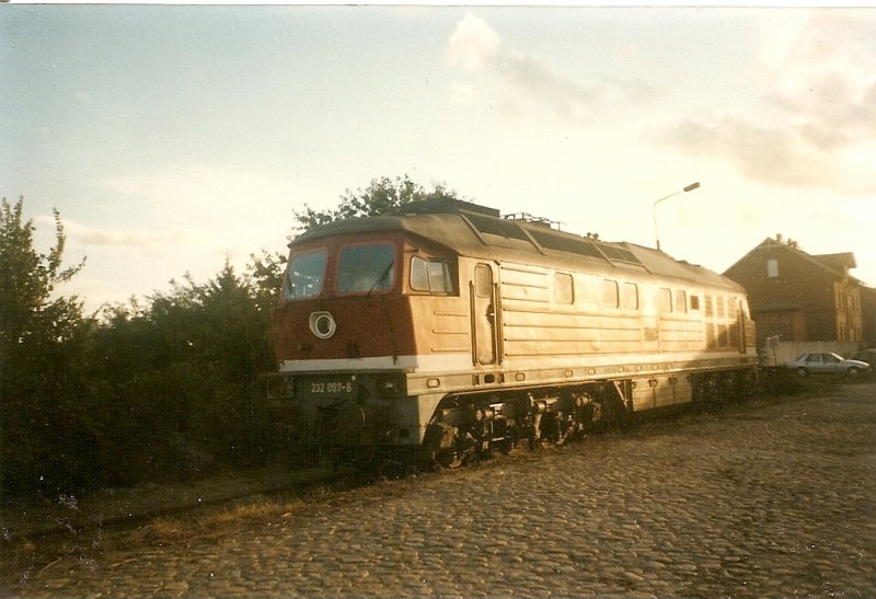232 097 an einem Septemberabend 1997 auf der Ladestraße in Sassnitz.