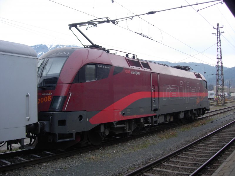 Die Br 1116 200-5 in Versuchslackierung für den neuen Railjet am 06.12.08 in Innsbruck