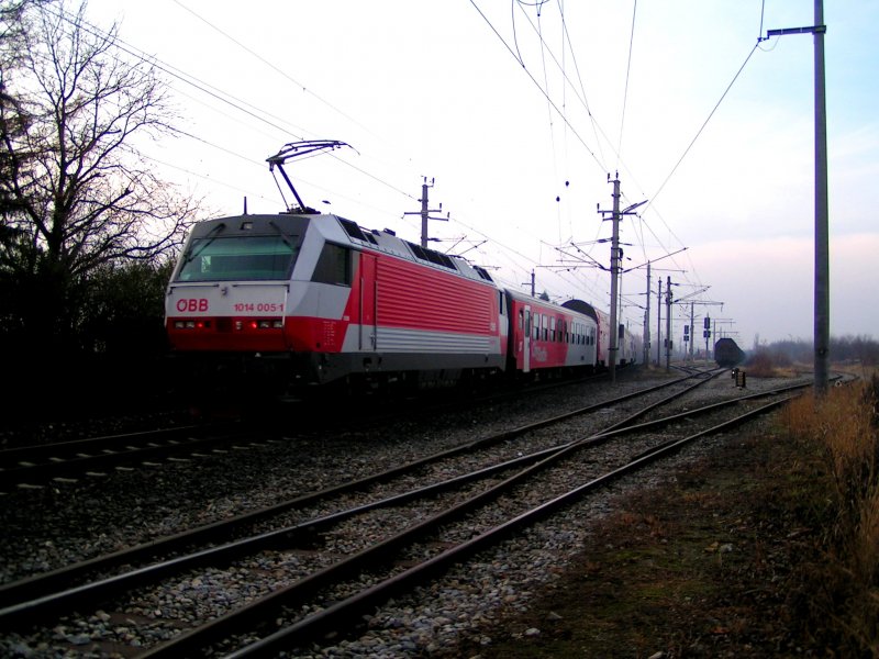 Zu hochwertigen OEC Ehren kam 1042 007 am 10.12.2008. Sie bespannte bis Selzthal den OEC 668 „CARITAS Kinderpatenschaften“ (Graz-Bregenz). Die Aufnahme entstand bei der Ausfahrt aus dem 400 Meter langen Kugelstein-Tunnel nach dem Bahnhof Peggau-Deutschfeistritz.